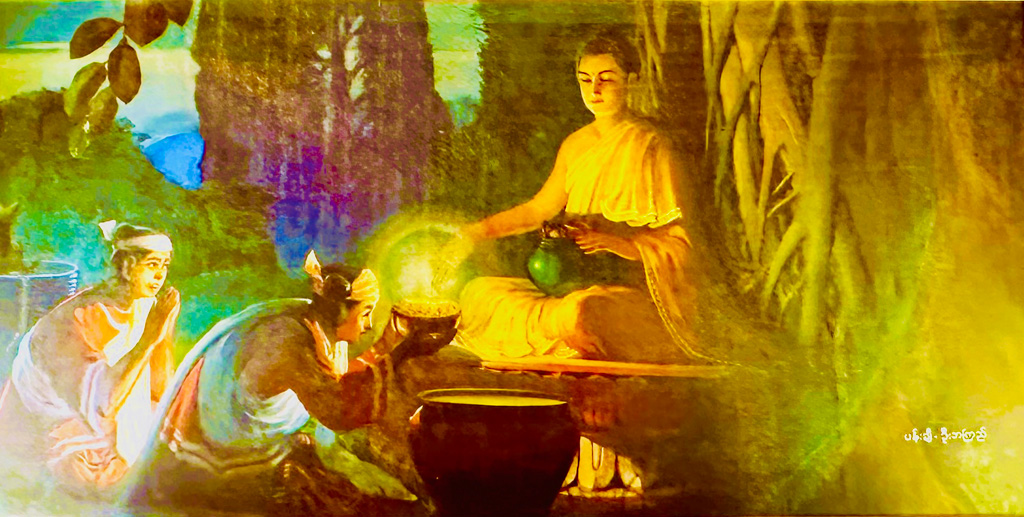 お釈迦さまは、覚りを得て、ブッダに成ったばかりの七週目の49日目に、インド・ブッダガヤの菩提樹の近くにあるレンロンという樹の下にお座りになられていました。その時、タプッサ(Tapussa)という兄とバッリカ(Bhallika)という弟の兄弟は、牛車でミャンマー国のウッカラーパ・ザナパダという町からマッジマデーサというインドの中部地方に商売をするために来ていました。その途中、樹の下で瞑想をされている仏陀と成られたお釈迦さまにお会いしたのです。この二人が、お釈迦さまと最初に出会うことは幸福です。お釈迦さまが正覚後、まだ、誰ともお会いする前、まず最初に、この二人がお会いしました。